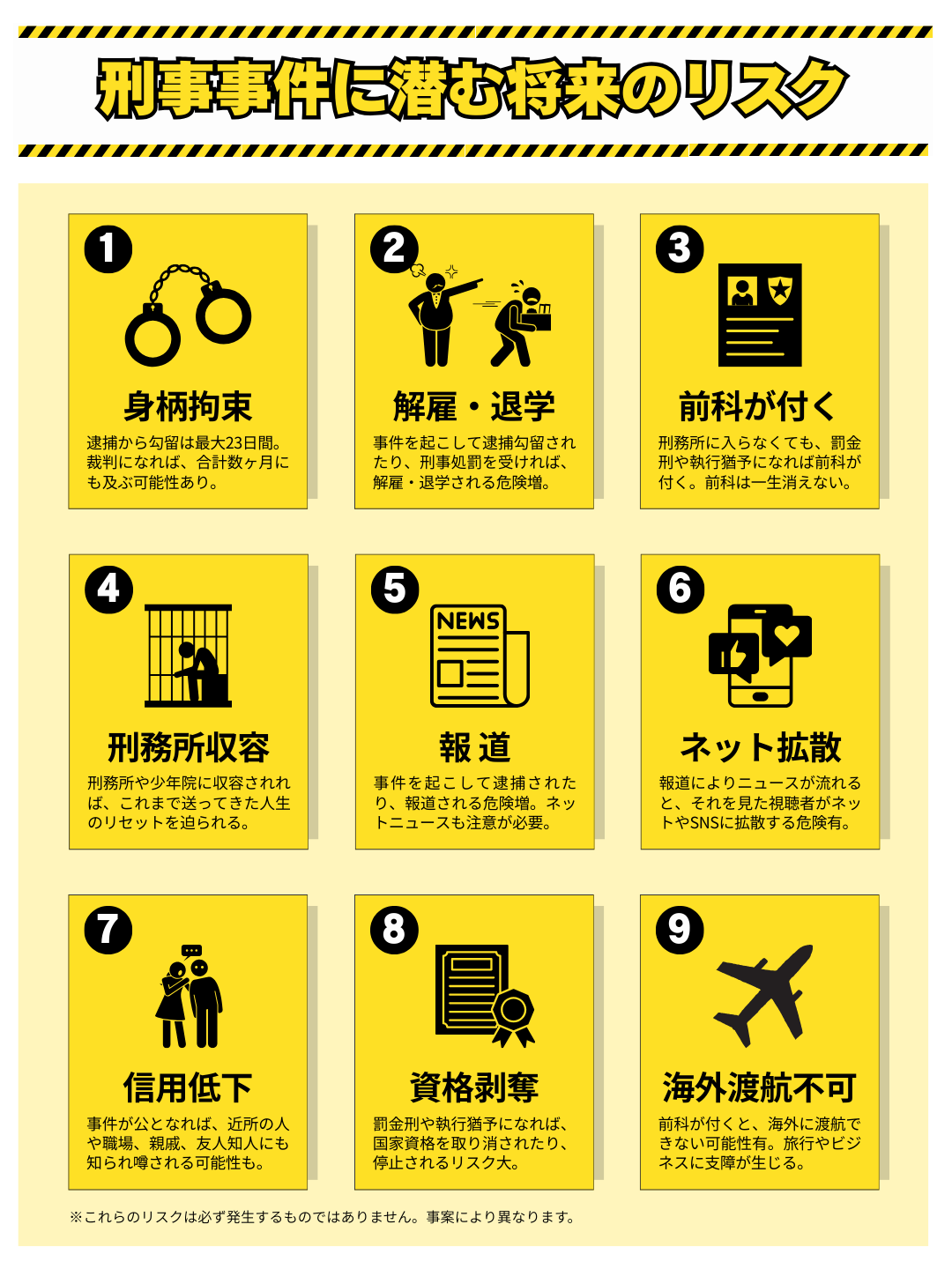 刑事事件により逮捕されたり、刑事処罰を受けると、懲戒解雇されたり、退学処分を受ける可能性が高まります。 - 前科が付くリスク