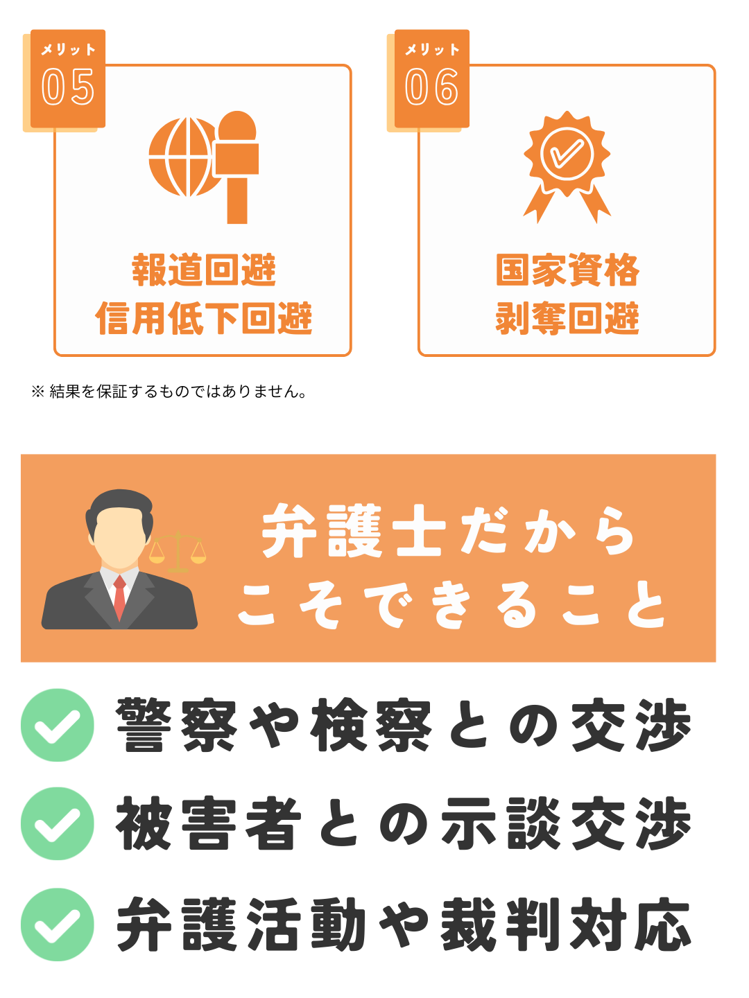 弁護士が警察などに連絡して、報道を未然に回避することで、報道やネット拡散による社会的信用の低下を防止できる可能性が高まります。 - 国家資格剥奪回避
