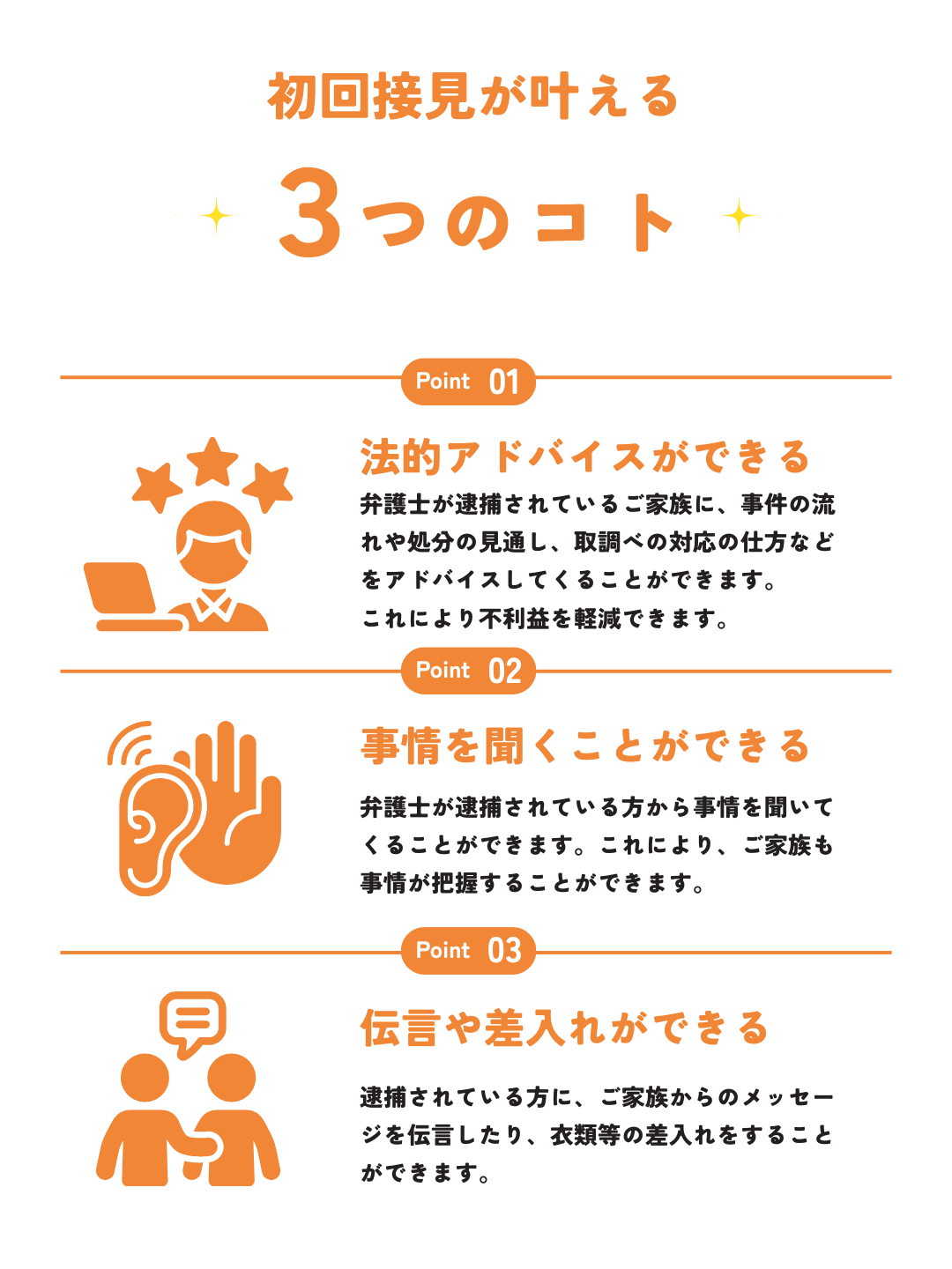 事前に、「逮捕されている方から聞いてきてほしいこと」「逮捕されている方に伝えたいこと」などをお聞きし、法律の範囲内で、できるだけご要望に沿って対応させていただきます。