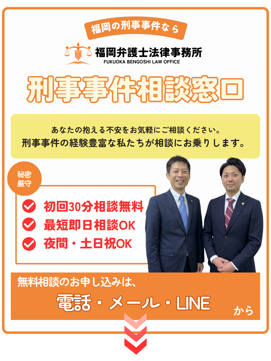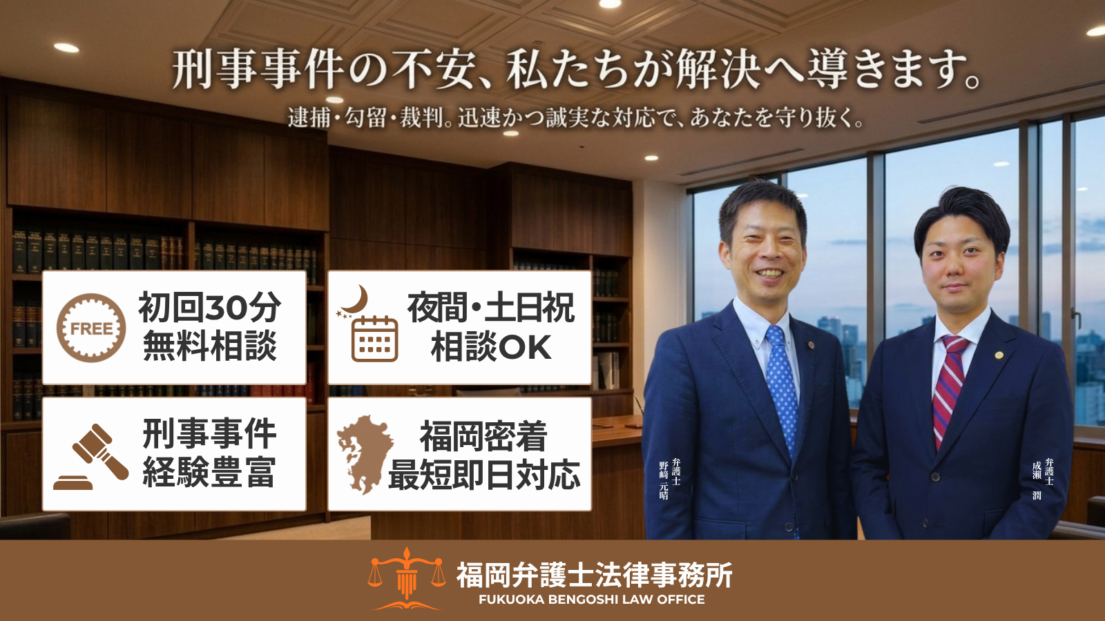 福岡弁護士法律事務所では、刑事事件の経験豊富な弁護士が、初回30分無料にて法律相談をお受けいただけます。