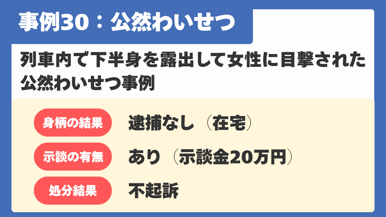 【事例30】列車内で下半身を露出して女性に目撃された公然わいせつ事例
