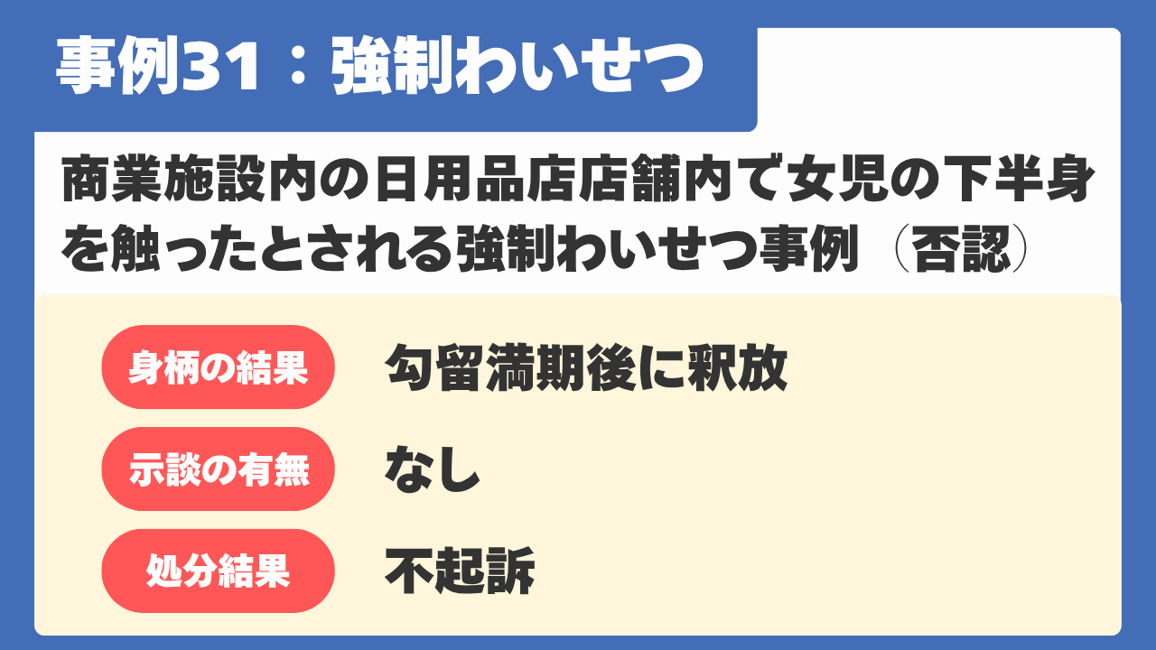 【事例31】商業施設内の日用品店店舗内で女児の下半身を触ったとされる強制わいせつ事例(否認事件)