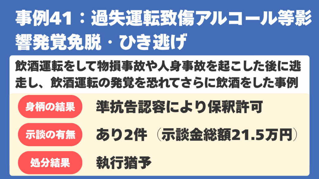 【事例41】飲酒運転をして物損事故や人身事故を起こした後に逃走し、飲酒運転の発覚を恐れてさらに飲酒をした事例