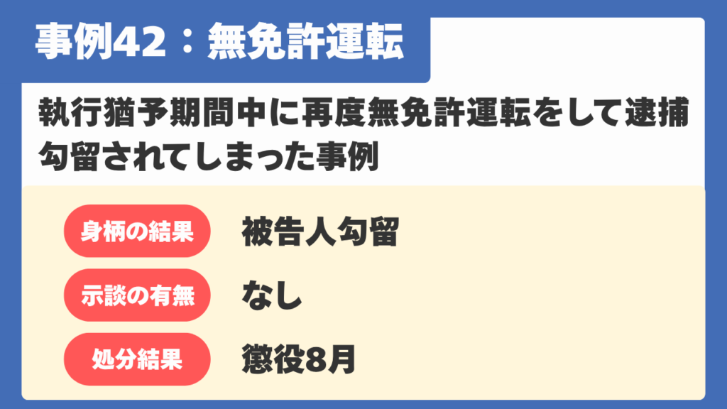 【事例42】執行猶予期間中に再度無免許運転をして逮捕勾留されてしまった事例