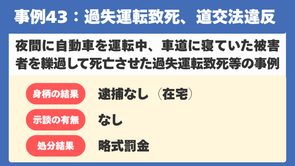 【事例43】夜間に自動車を運転中、車道に寝ていた被害者を轢過して死亡させた過失運転致死事例