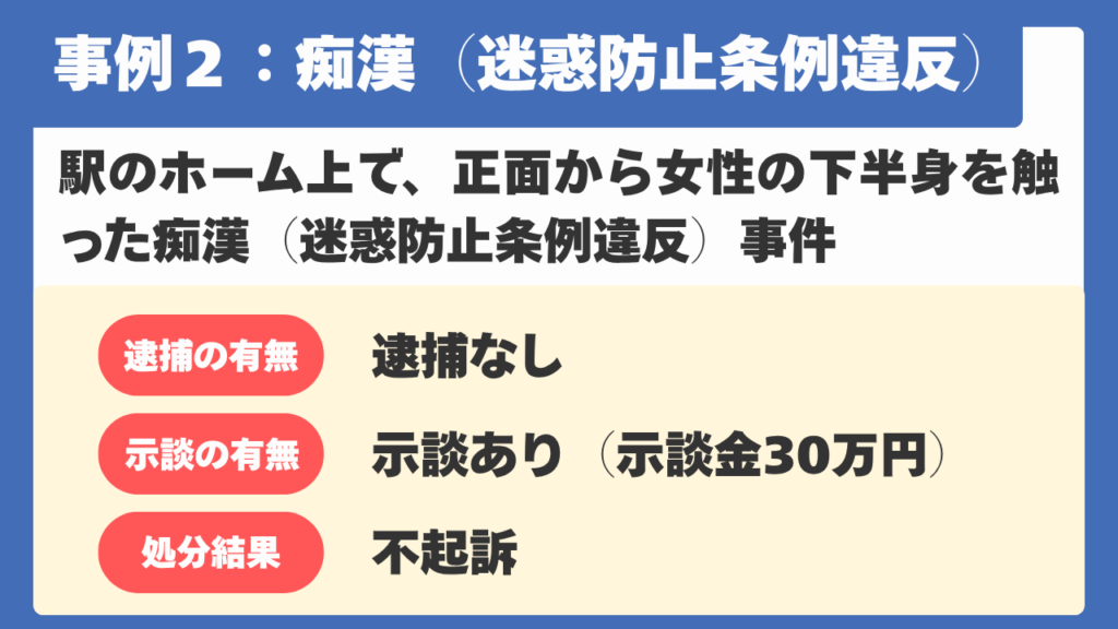 【事例2】駅のホーム上を歩行中の被害女性の下半身を触った痴漢(迷惑防止条例違反)事件
