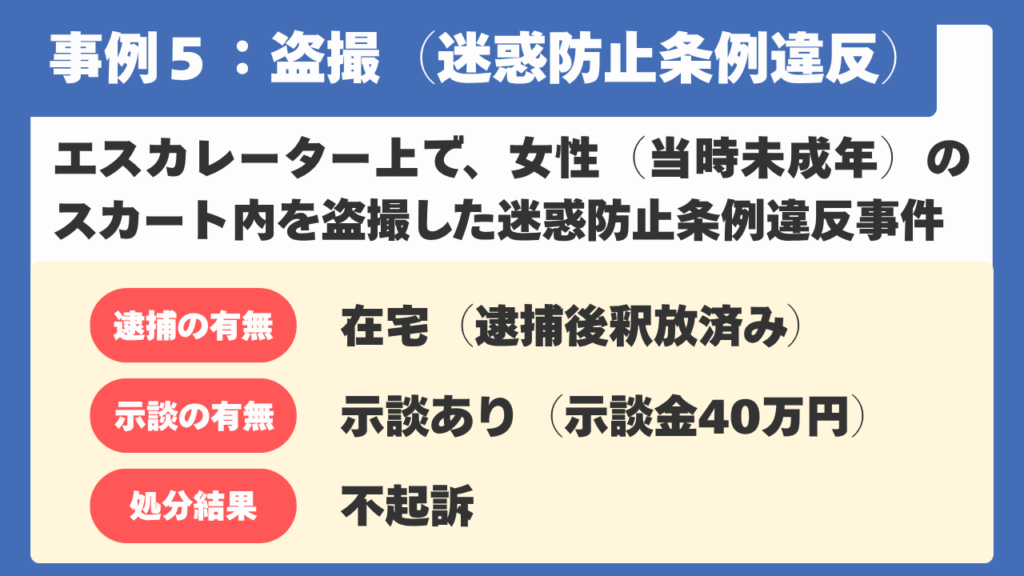 【事例5】駅近郊のエスカレーター上で、当時未成年の女性のスカート内を盗撮した迷惑防止条例違反事件