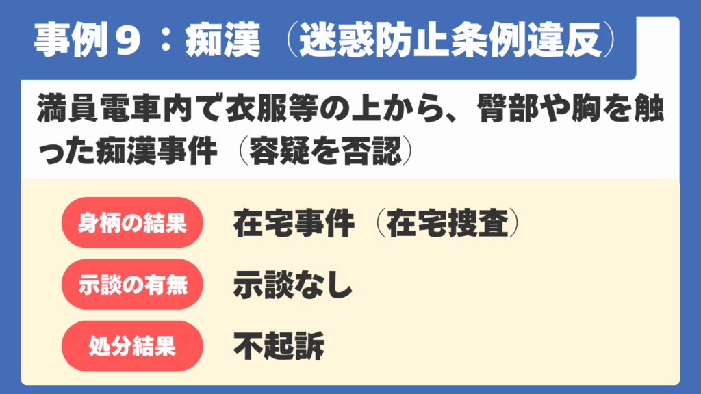 【事例9】満員電車内で衣服の上から女性の臀部や胸を触ったという容疑をかけられた痴漢冤罪事件