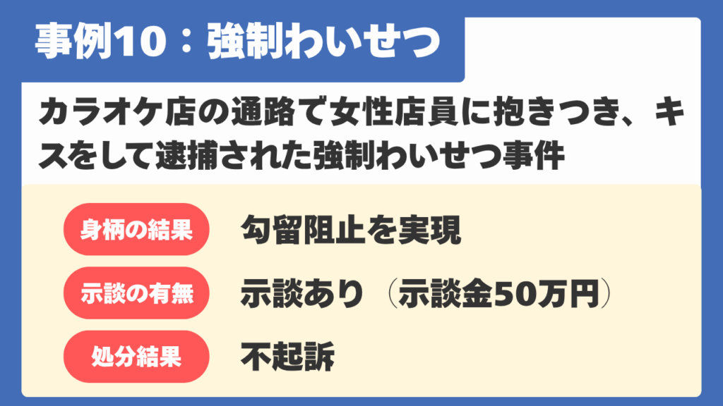 【事例10】カラオケ店内の通路で店員に抱きつきキスをした強制わいせつ事件