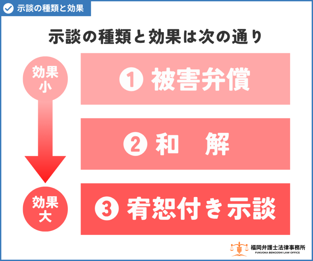 そして、この示談には大きく分けて「被害弁償」「和解」「宥恕付き示談」の3種類があり、どの対応ができるかにより、得られる効果が異なってきます。