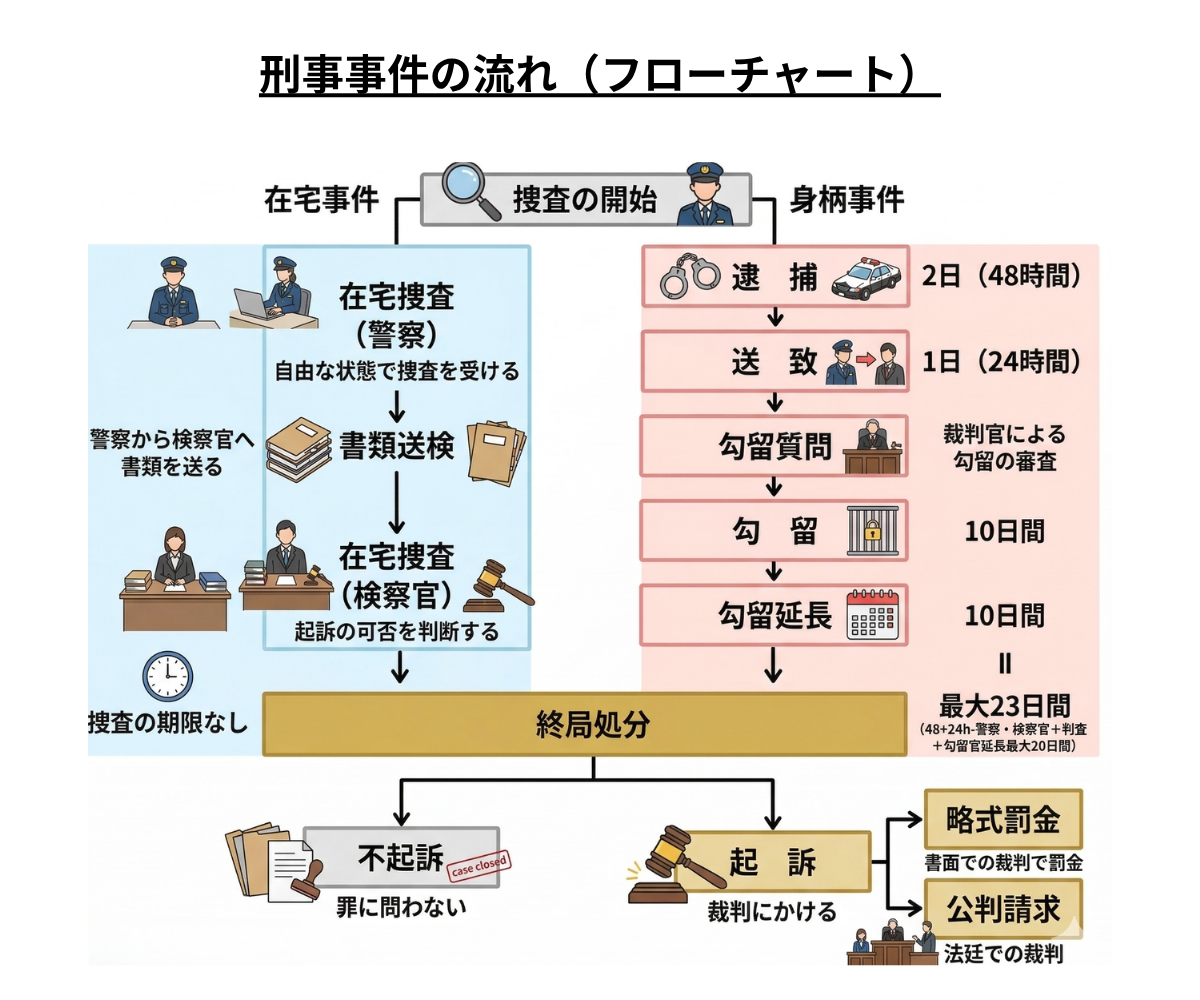刑事事件では、在宅事件と身柄事件のいずれかの流れで捜査が進んでいきます。