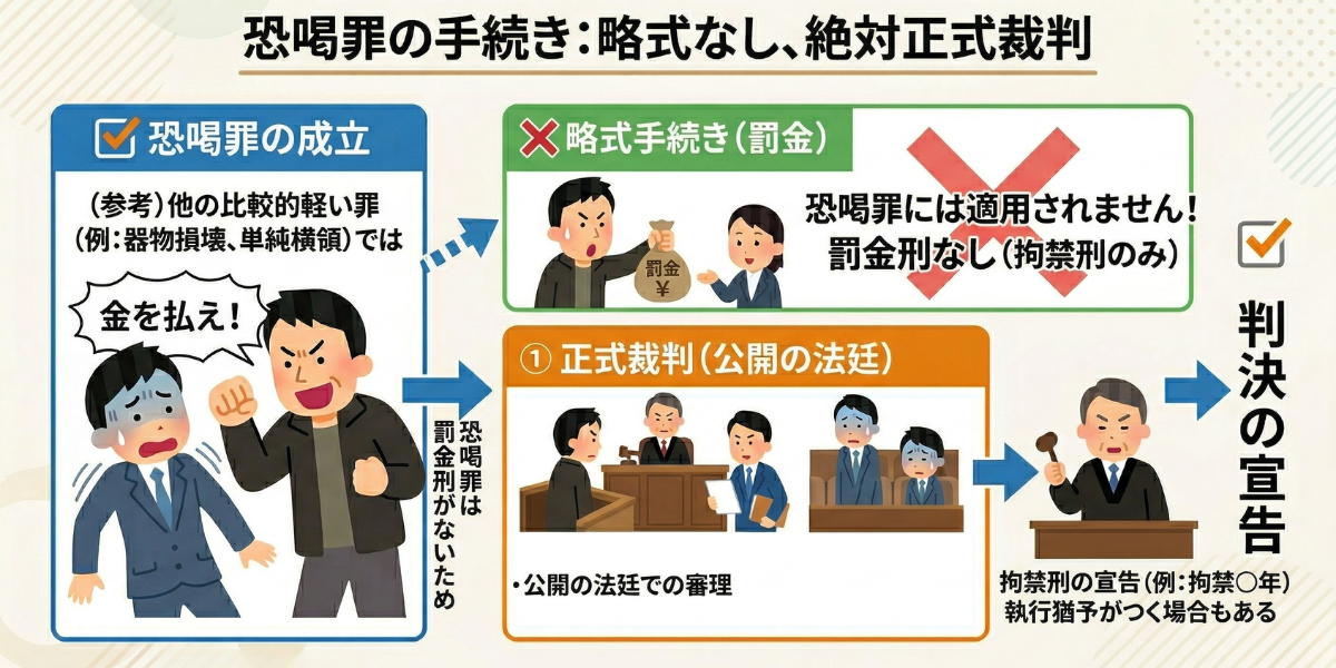恐喝罪は「10年以下の拘禁刑に処する」と規定されており、「罰金刑」がありません。ですので、起訴される場合には絶対に裁判です。