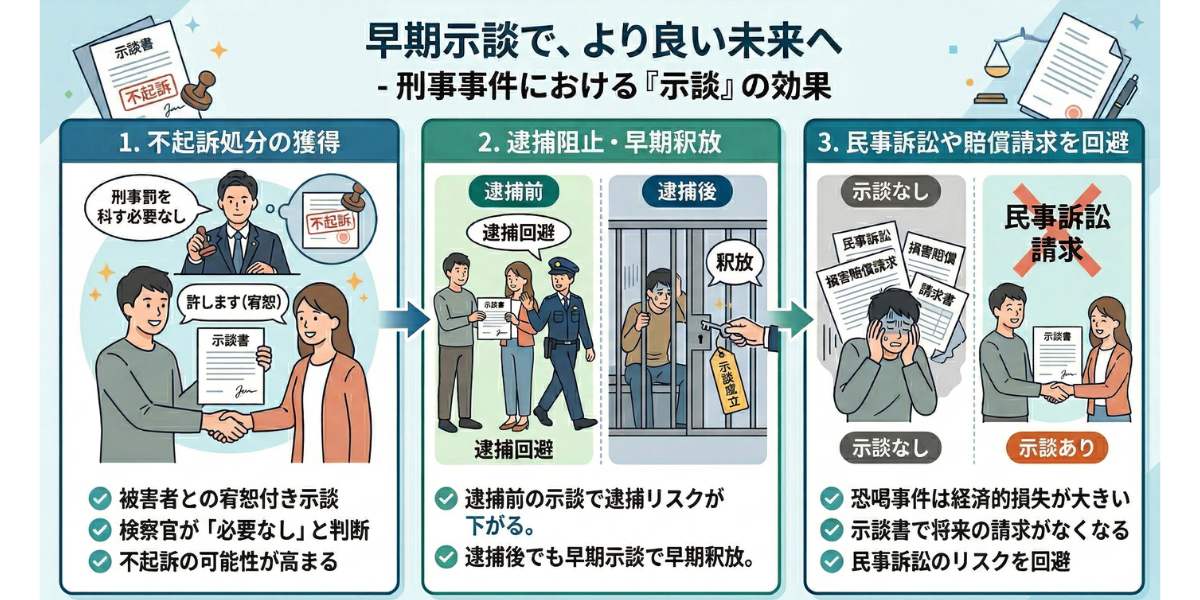 他の刑事事件でも同じことが言えますが、恐喝事件でも示談が有効な手段となります。示談にはこのようなメリットがあるので、一度は確認しておきましょう。