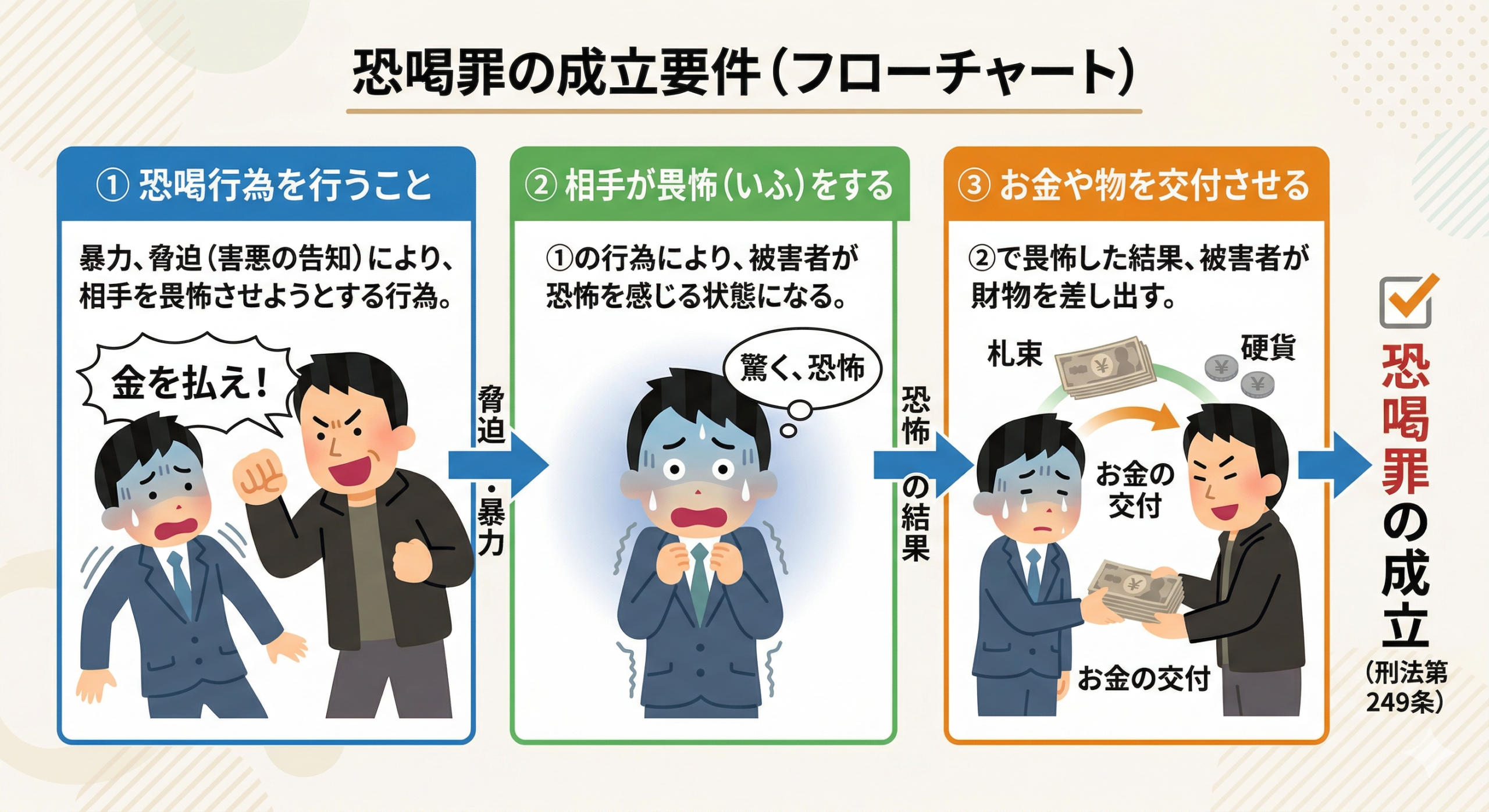 恐喝と言うと、カツアゲやオヤジ狩りをイメージすると思いますが、脅せばよいと言うものではありません。次のステップが繋がっている必要があります。