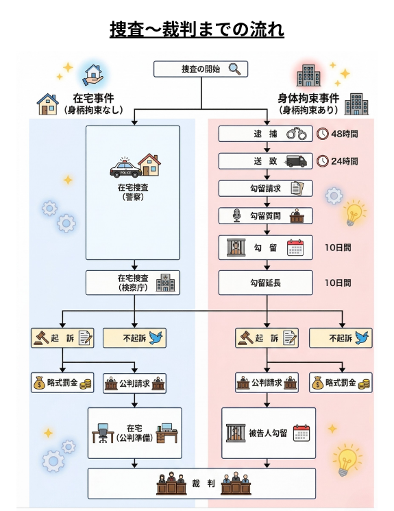 刑事事件は、警察が捜査を開始後、在宅事件か身柄事件のいずれかの流れで手続が進みます。