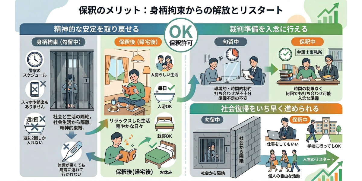 精神的に追い詰められてしまうのも当然でしょう。だからこそ、普段の人間らしい生活を取り戻し、精神的に安定してもらうために保釈を通して帰宅する必要があります。