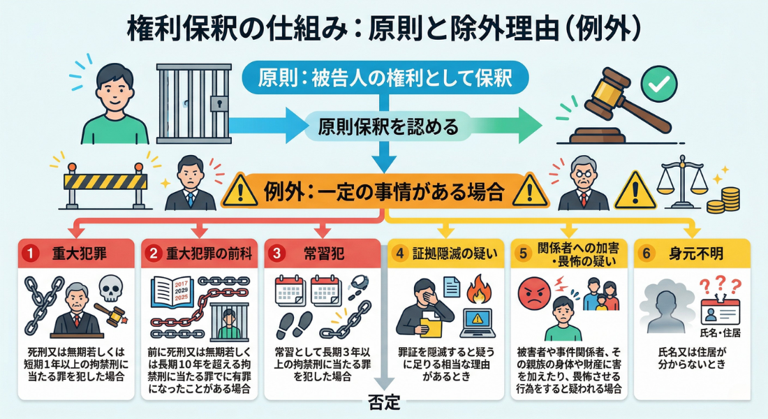 ですので、原則保釈が認められますが、例外的に一定の事情がある場合には保釈が否定されるという枠組みになっています。