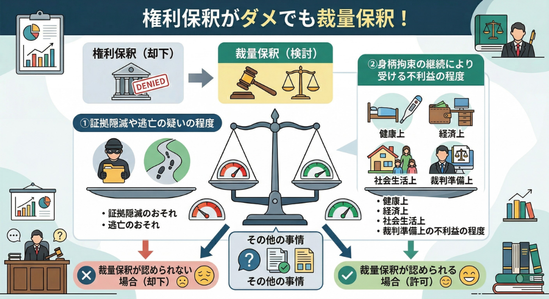要するに、①証拠隠滅や逃亡する疑いの程度と、②身柄拘束の継続により身柄拘束されている人が受ける健康上、経済上、社会生活上、裁判準備上の不利益の程度を比較して、②身柄拘束されている人が受ける不利益の方が大きければ裁量保釈が認められます。