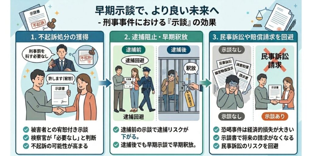しかし、被害者と示談をすることで、証拠隠滅の恐れが下がったと評価され、逮捕が阻止できたり、早期釈放が実現しやすくなります。