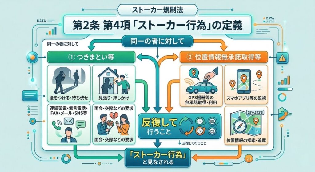 ストーカー規制法によれば、ストーカー行為は、同一人物に対して、①つきまとい等または②位置情報無承諾取得等のいずれかを反復して行うことと定義されています。