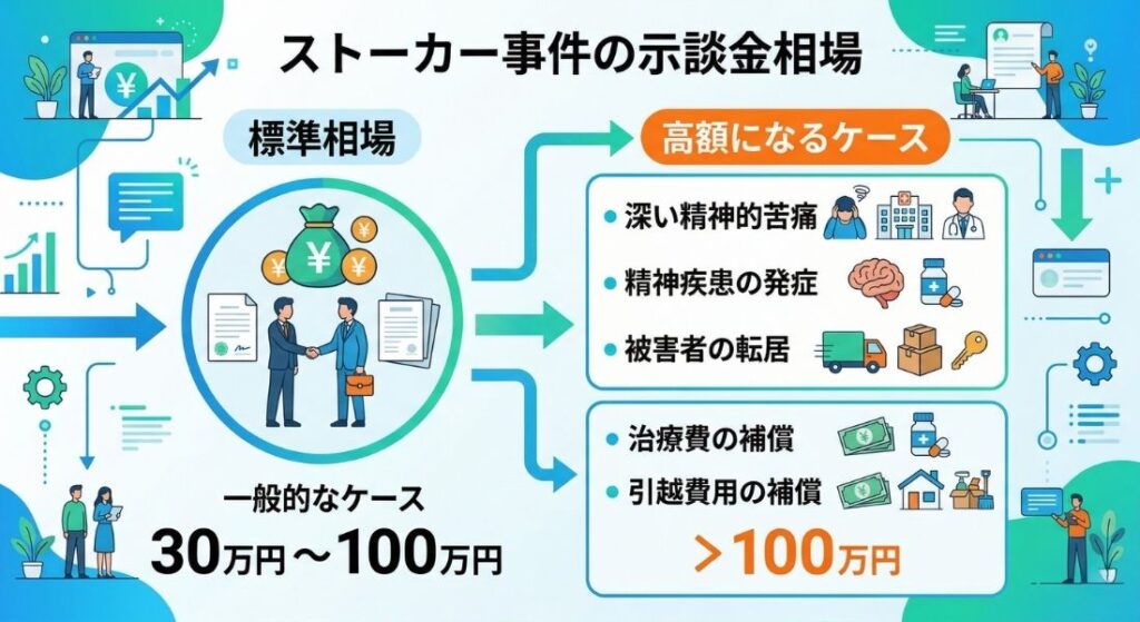 ストーカー事件の示談金相場は、30万円〜100万円程度と考えられます。