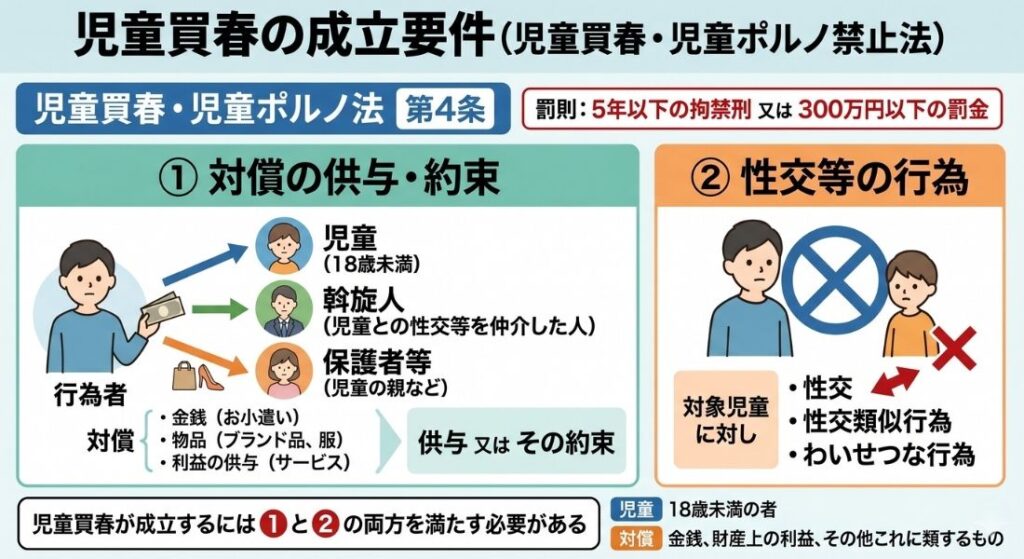 児童買春は、「児童等に対して対償を供与し、またはその供与の約束をすること」が成立条件となります。