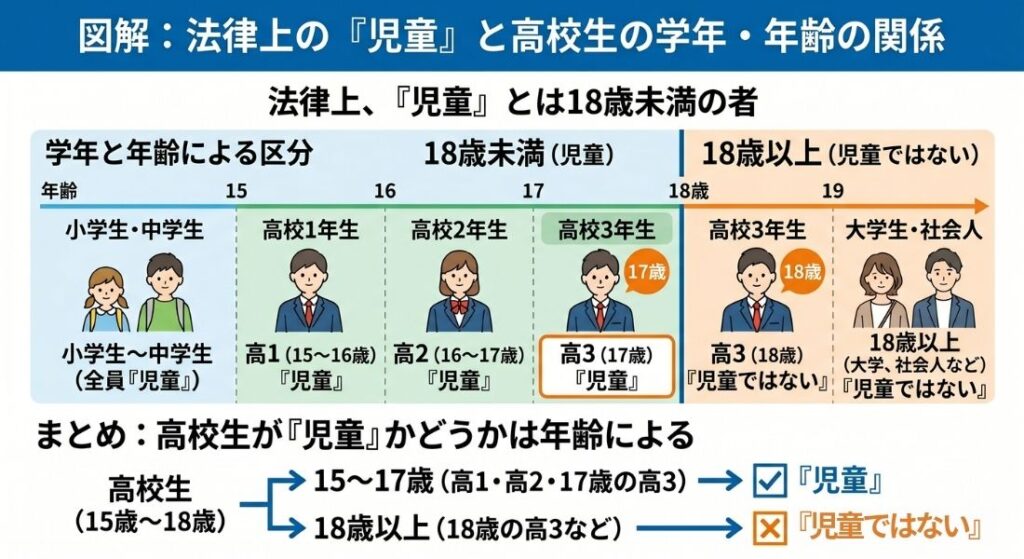 では、そもそも「児童」とは誰を指すのでしょうか?中学生は児童のように思いますが、高校生も児童に該当するでしょうか?