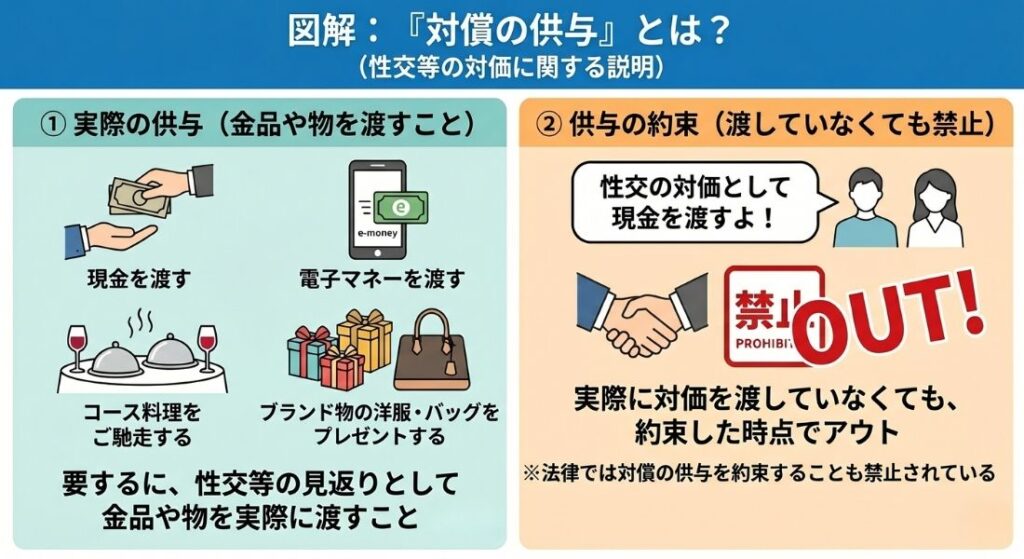 「対償の供与」とは、要するに性交等の見返りとして金品や物を実際に渡すことを言います。性交等の対価のことです。