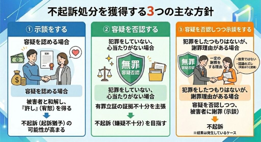 不起訴処分の獲得方針は次の通り3つあり、これは容疑を認めているか否定しているか、示談を希望するかどうかにより変わってきます。