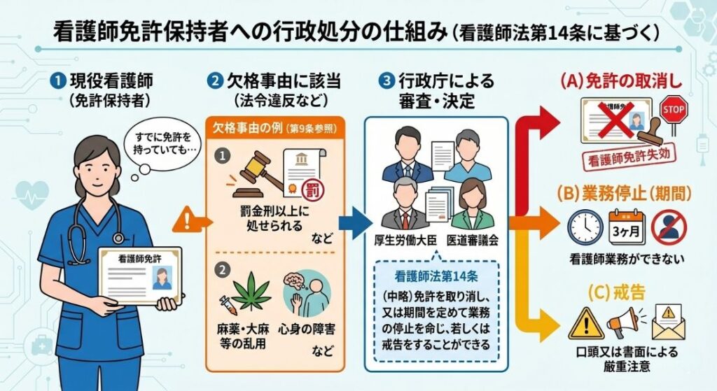 すでに免許を持っている現役看護師の場合も、看護師法第14条の規定上、「罰金刑以上に処せられる」などの欠格事由に該当する場合には、免許の取消し、業務停止、戒告のいずれかの処分を受ける可能性があります。