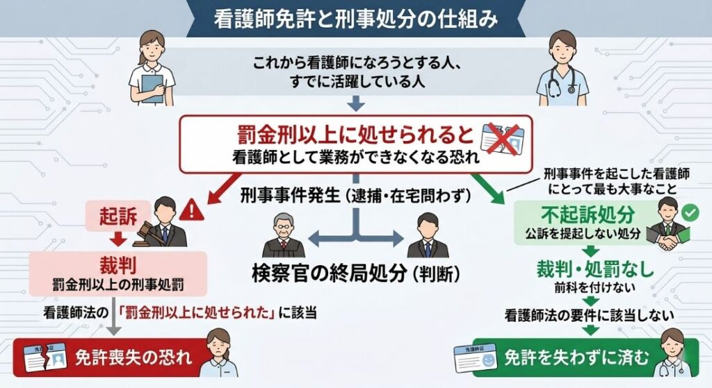 不起訴処分とは、検察官が公訴を提起しない処分のことです。刑事事件では、逮捕される事件も逮捕されない事件も、最終的に検察官の終局処分が待っています。検察官の終局処分とは、起訴するか、不起訴にするかを決定することです。起訴されれば、裁判や罰金刑以上の刑事処罰が待っていますが、不起訴であれば裁判や処罰はありません。看護師法の「罰金刑以上に処せられた」に該当しないので、免許を失わずに済みます。